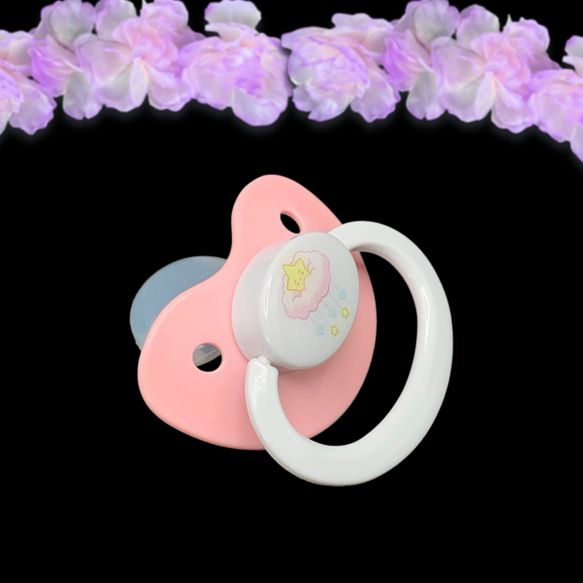 Soothe your inner child with our kawaii adult pacifier, featuring a pink cloud baby mobile image. Embrace your playful side with this cute accessory.
