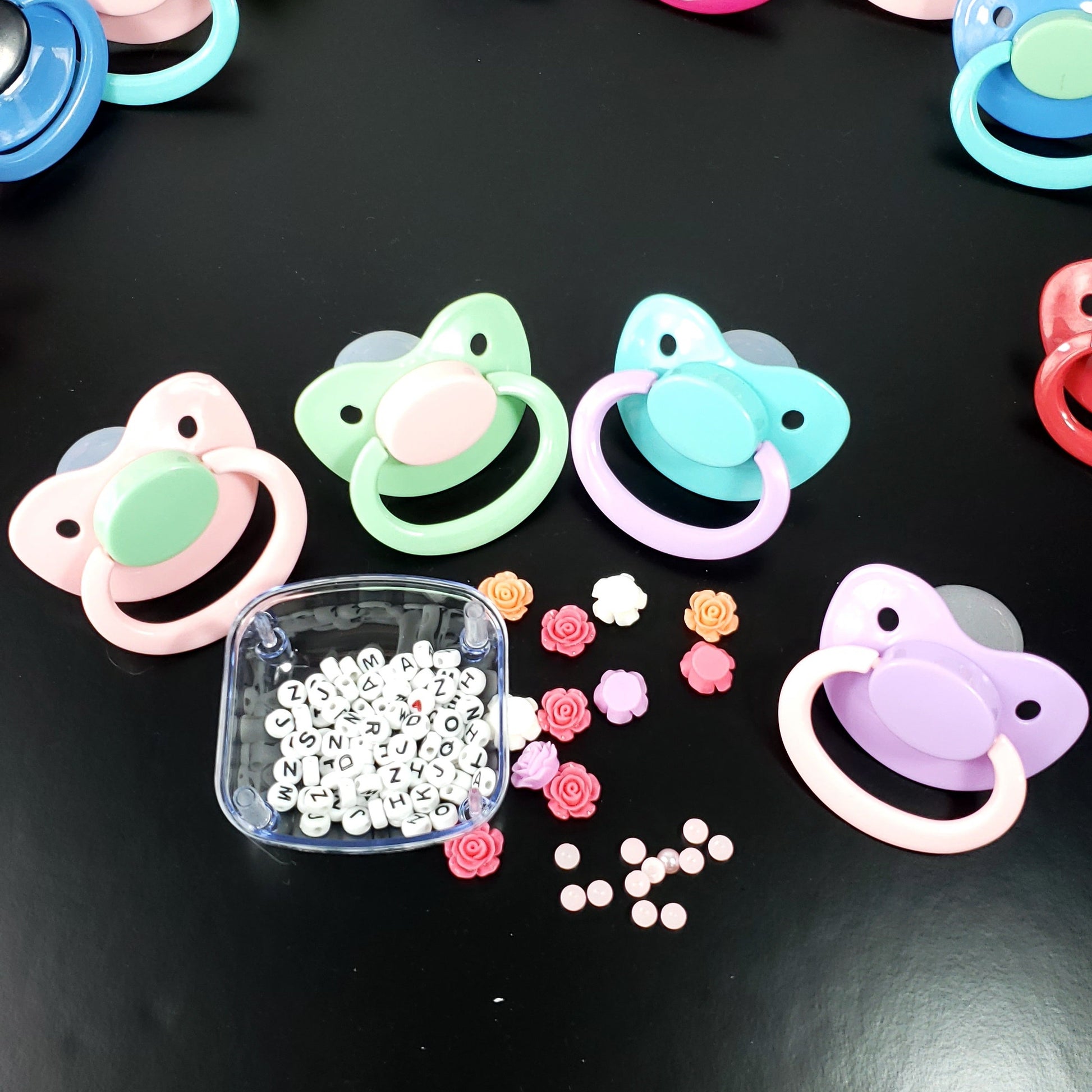 Who says you have to grow up? Have some fun with this Bulk DIY adult pacifier kit! Comes with plain pacifiers in various colors. Great for baby showers or little parties! Decorations not sold in this listing.