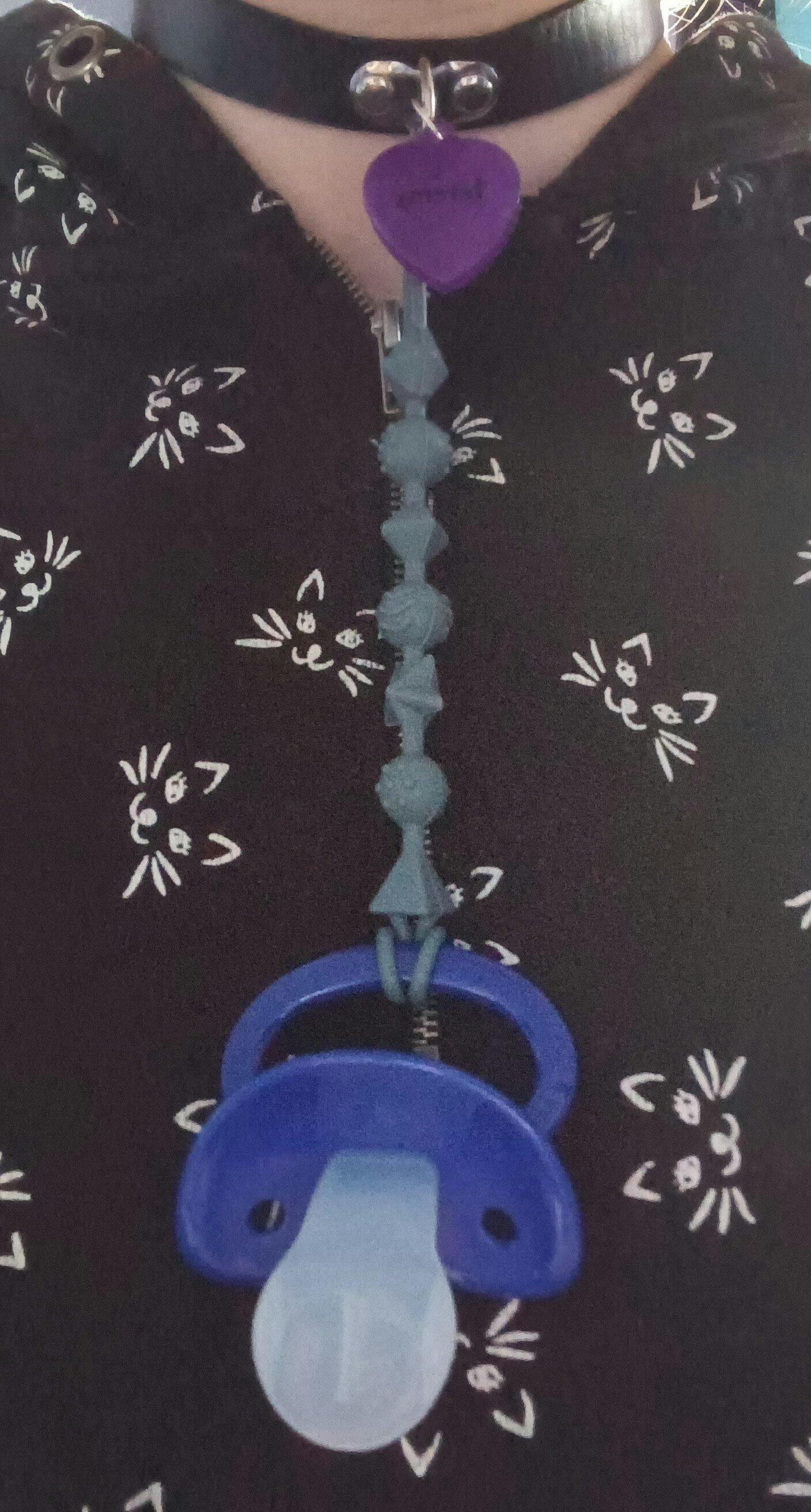 I got this product to help me with my sfw age regression since it was customizable to make it all mine and personal! And it's absolutely amazing, the collar feels just right and having the option of either the pacifier or the silicone strand right there together is so so good for someone who switches back and forth between needing to chew and just wanting a soother. The pacifier is a great fit and the different textures on the chewy are marvelous! I love having it on when I sleep and waking up and being reminded that everything is safe 💜 I was also able to make the tag double sided to have my name as well as my caregiver's name on it so I always feel protected and grounded :3 As I'm getting more comfortable with this coping mechanism I'm so glad I was able to buy this little (literally) piece of gear to add to it! Recommended, the one's running the shop are so kind and helpful to answer any questions! Keep on keeping on!!