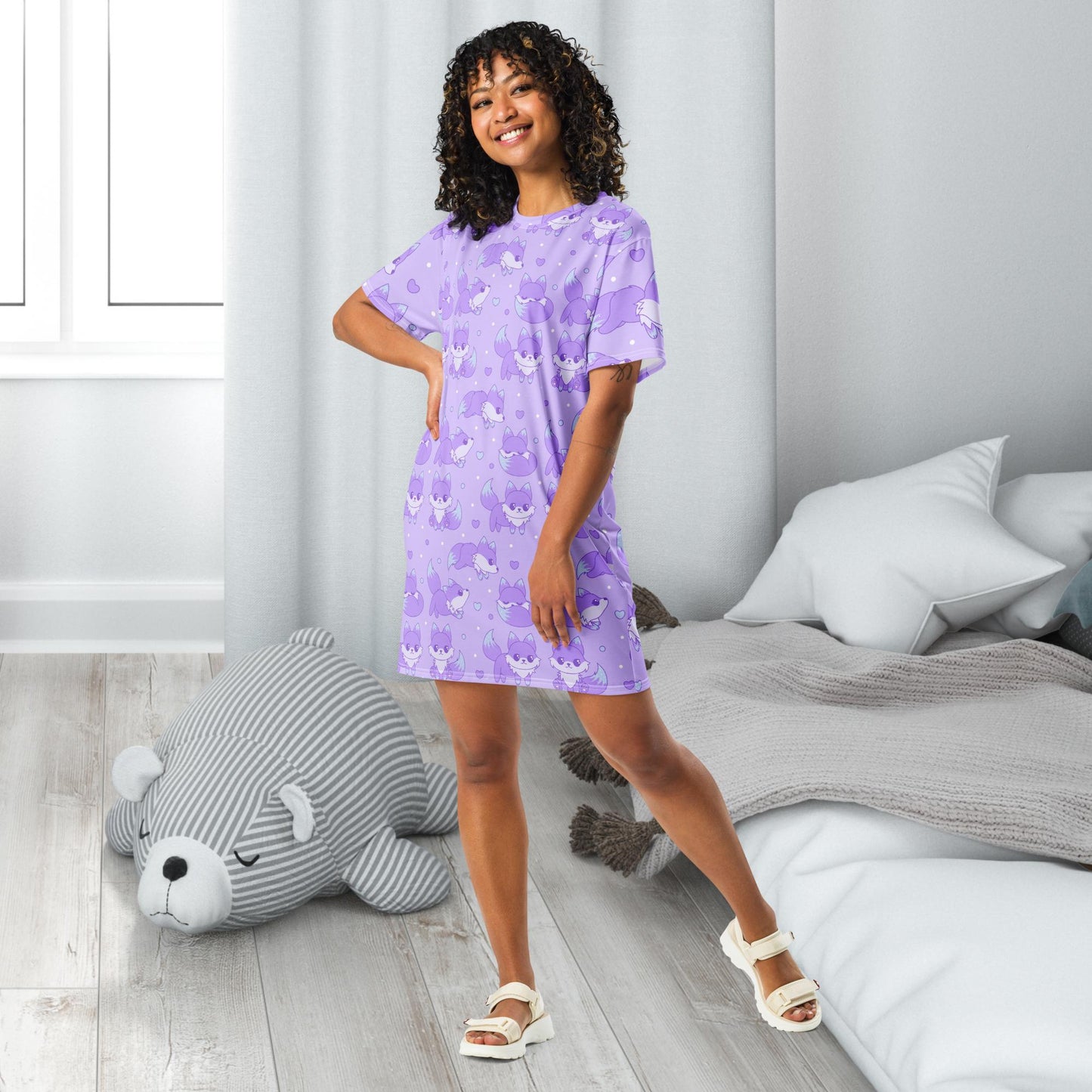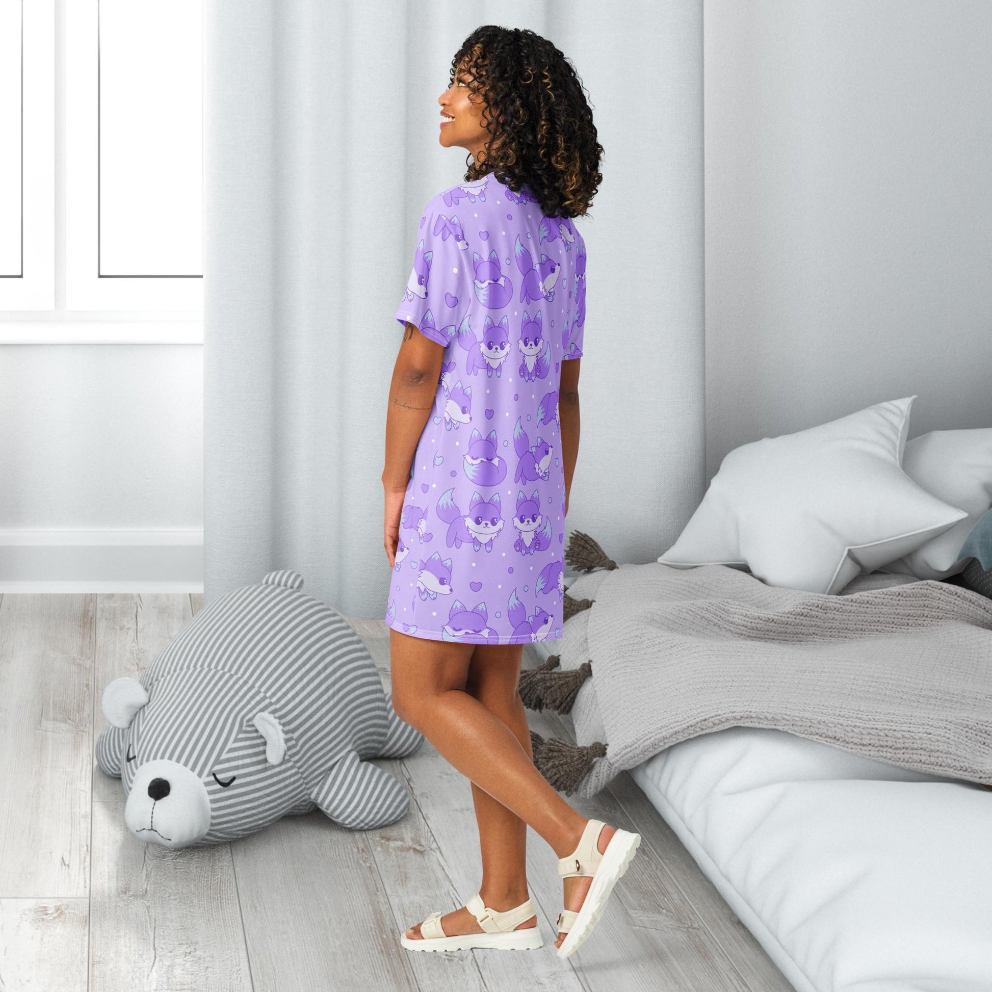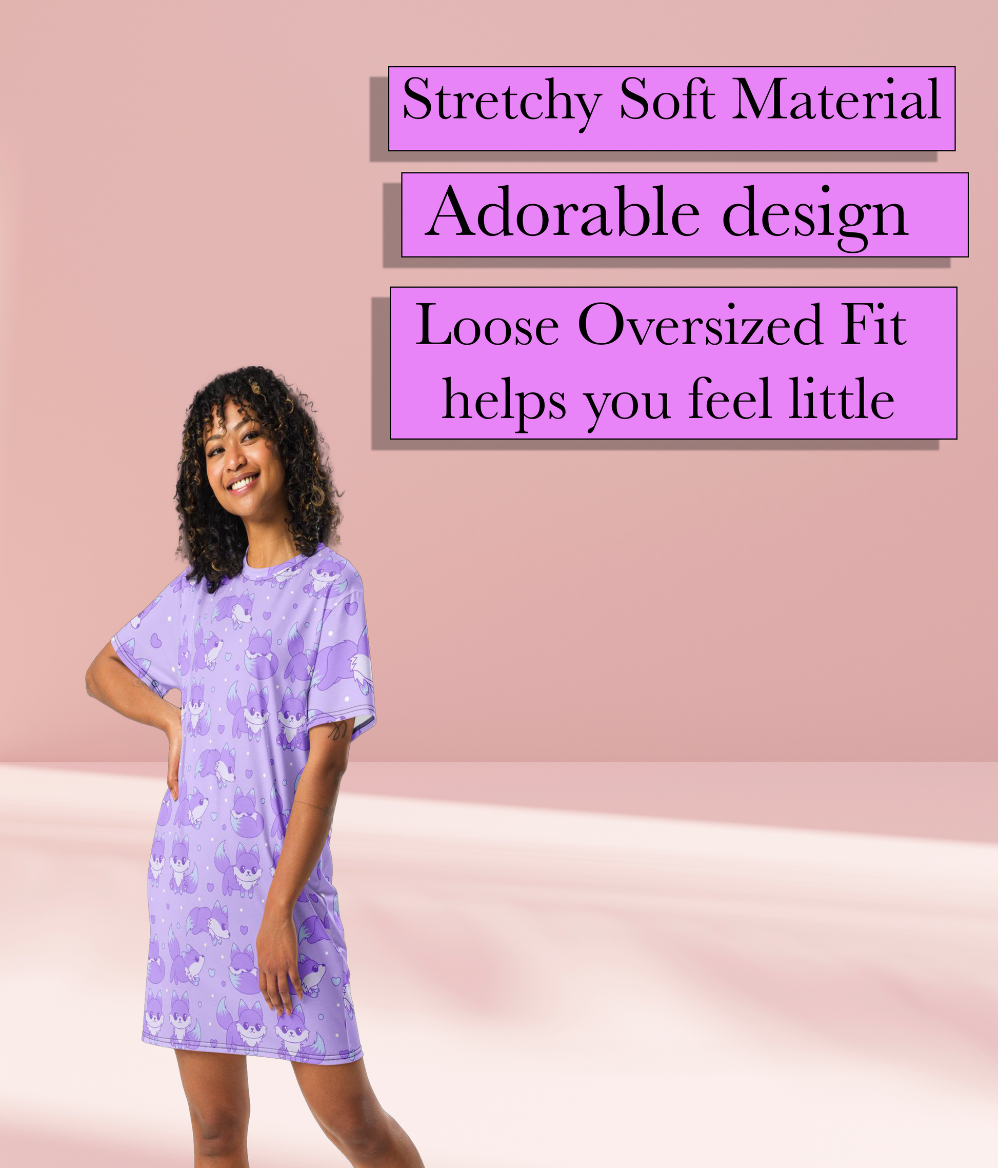 "Galaxy Fox" T-Shirt Dress Nightgown: Drift into dreamland with our enchanting "Galaxy Fox" t-shirt dress nightgown! Featuring a stunning galaxy-inspired design with a whimsical fox, this nightgown combines style and comfort. Made from soft, breathable fabric, it's perfect for lounging or sleeping in style. Let your imagination soar among the stars with this magical nightgown!