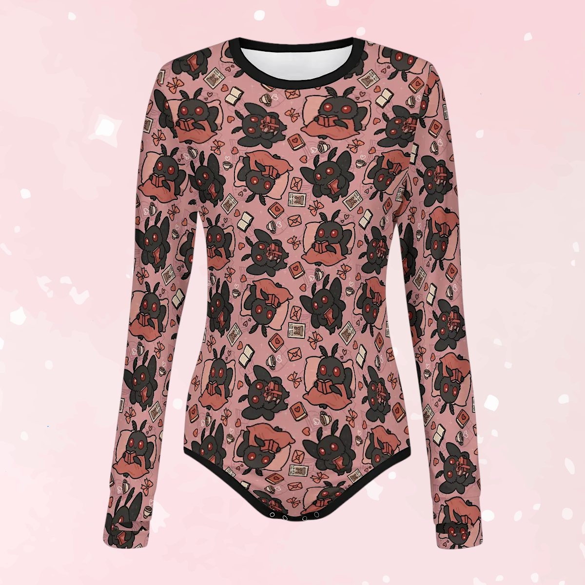 The all-over print features adorable Mothman illustrations surrounded by letters, hearts, and cryptic details, capturing that perfect blend of eerie and endearing.