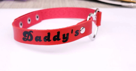 This listing is for a cute and sexy PU leather choker collar! Red with vinyl saying Daddy's Slut! Adjustable with 3 size options.