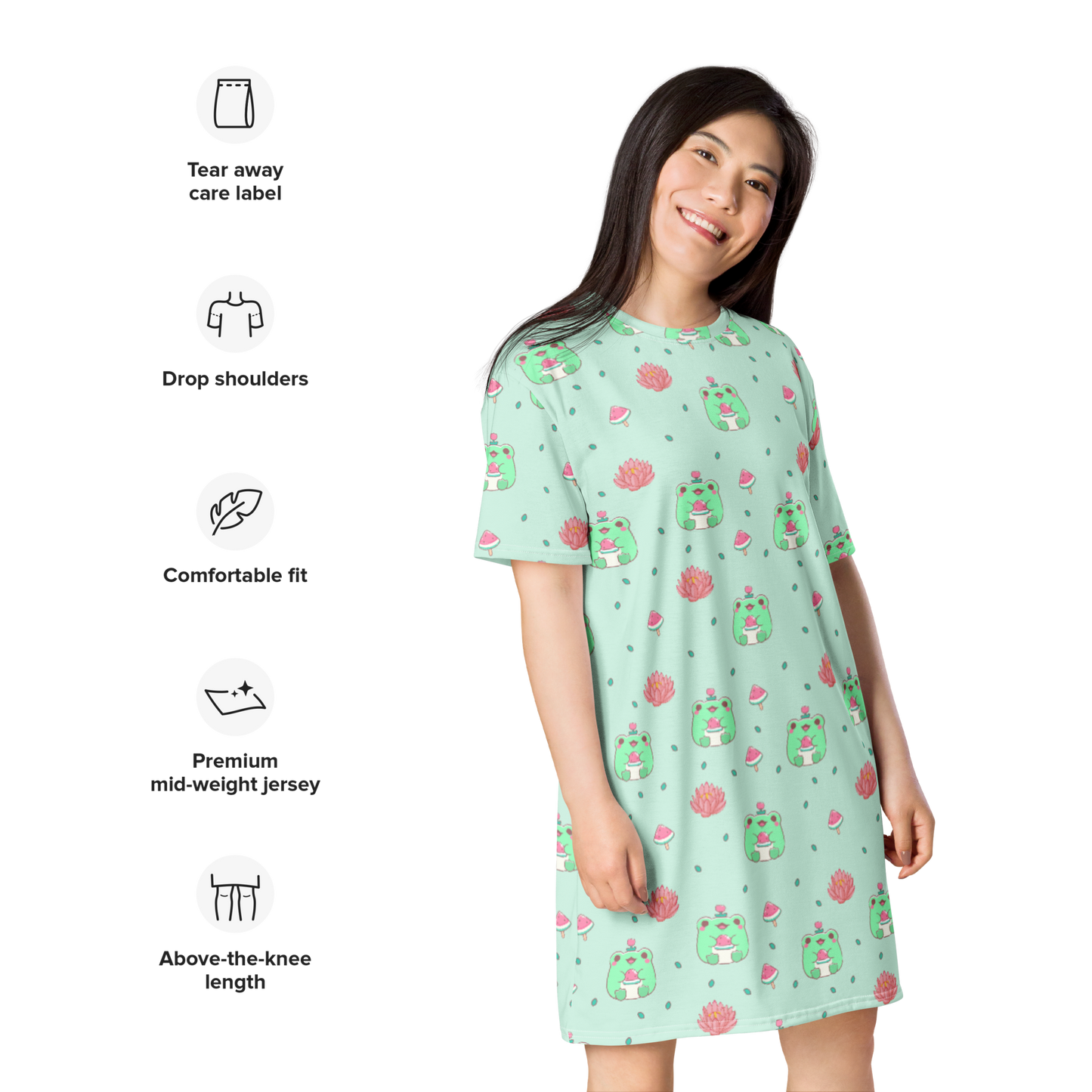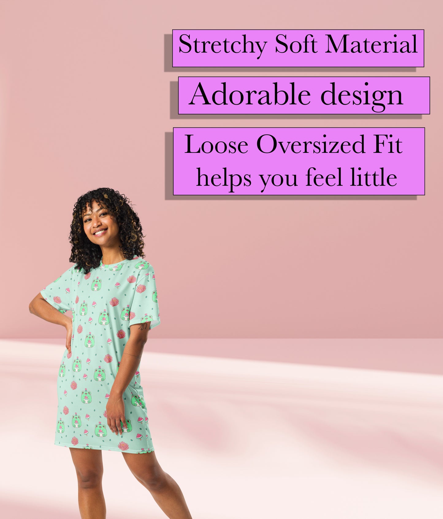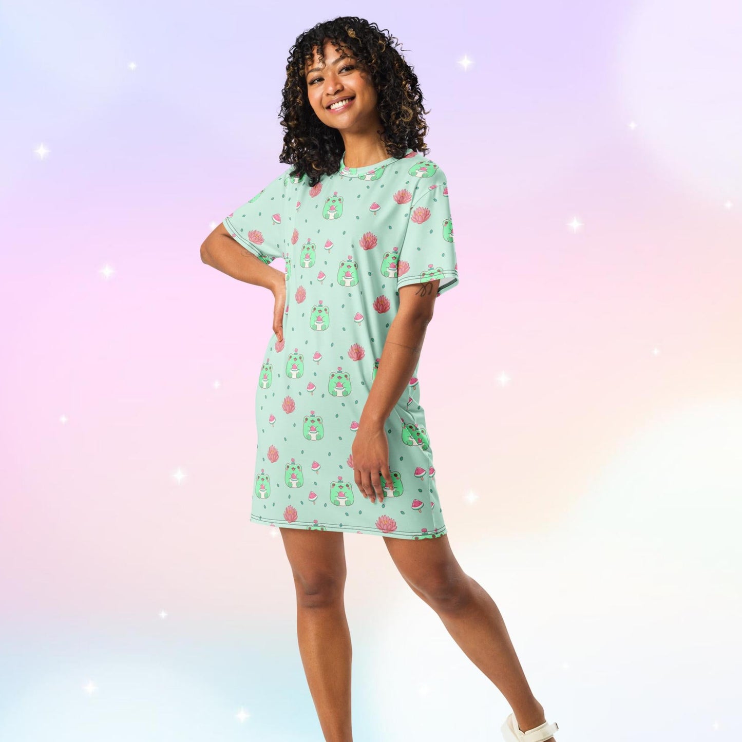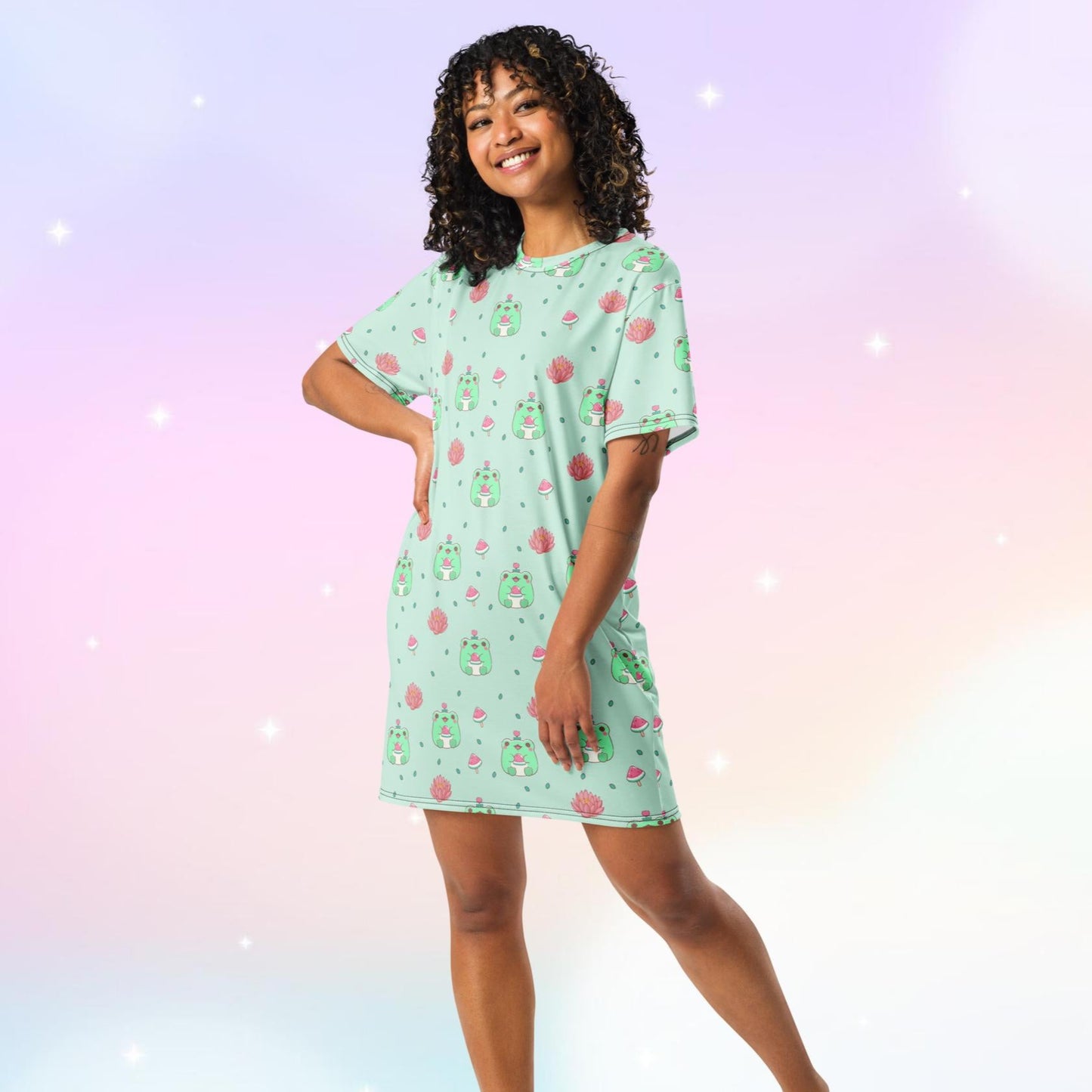 Unleash your inner child with our Kawaii Frogs Night Gown T-Shirt Dress. Featuring adorable frogs, watermelons, and lotus flowers, this cozy nightgown will transport you to a whimsical dreamland. Say goodbye to boring pajamas and hello to a fun and quirky night time outfit!